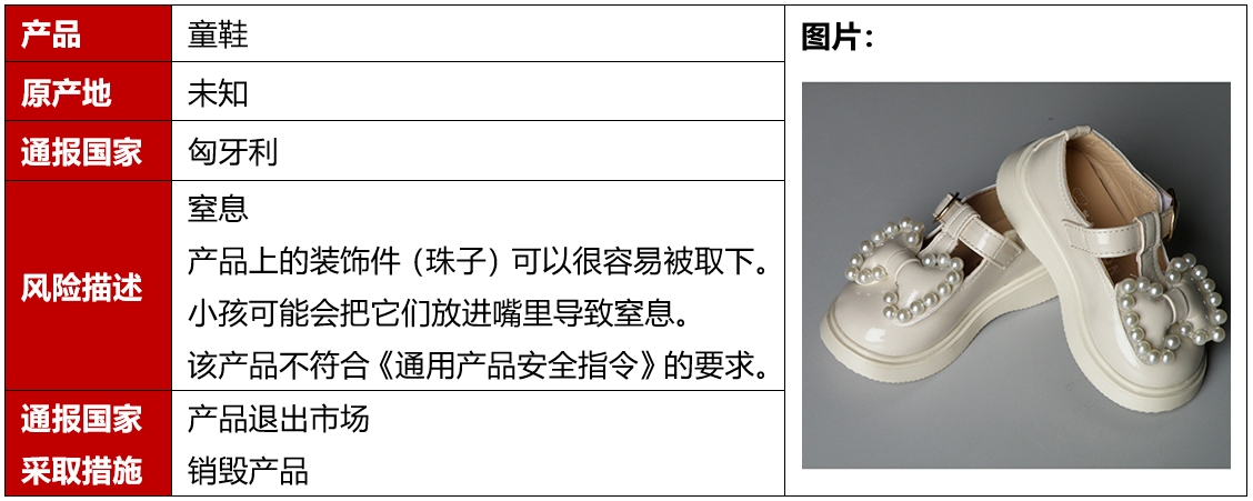 2024年4月,欧盟、美国、加拿大和澳洲共发生1例鞋类召回案例。该召回发生在欧盟,且是因为存在窒息风险被召回的。