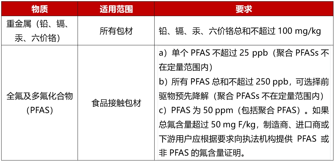 扩大包装中有害物质限制,在限制铅、镉、汞、六价铬4项重金属的基础上,针对食品接触包材新增了全氟及多氟化合物(PFAS)的限制,具体要求如下: