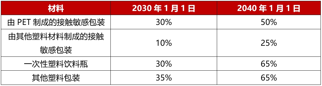 未来投放市场的任何塑料包装部件都必须含有最低百分比的回收成分,这些成分是从消费后塑料废物中回收的,并按每个制造厂和年份的平均值计算。最低百分比因包装类型而异: