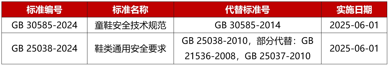 其中涉及2项鞋类标准,包括GB 25038-2024《鞋类通用安全要求》和GB 30585-2024《童鞋安全技术规范》,并均将于2025年6月1日正式实施。