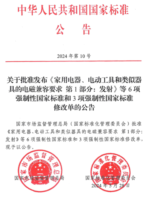 2024年5月28日,国家市场监督管理总局(国家标准化管理委员会)发布2024年第10号公告,批准6项强制性国家标准和3项强制性国家标准修改单。