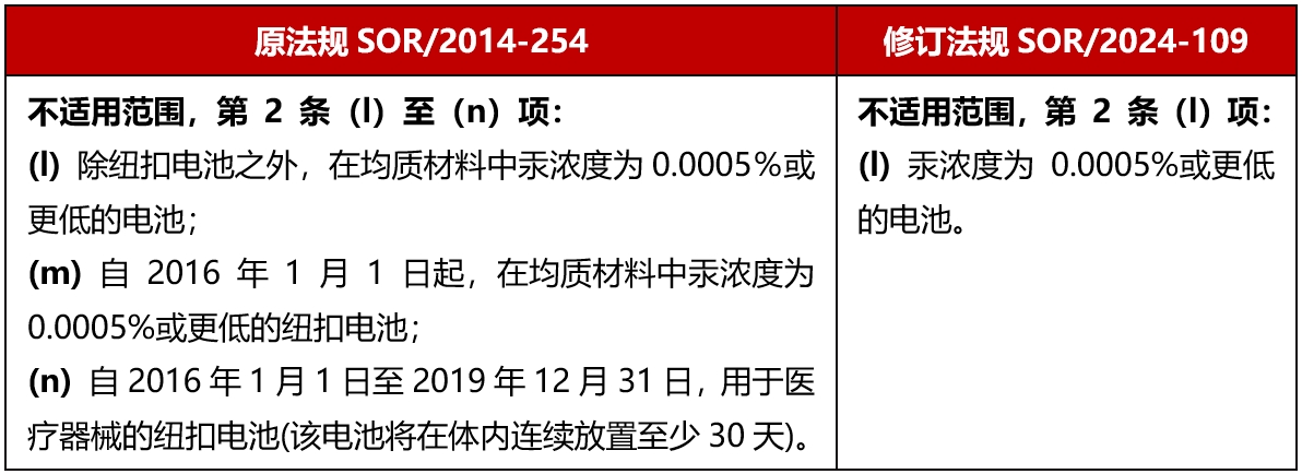 [导读]: 2024年6月19日,加拿大官方公报发布SOR/2024-109,对产品含汞法规 SOR/2014-254 进行修订,修订法规将自官方公报公布之日起一年后,也就是2025年6月19日生效。 该修订法规主要修订了电池中汞含量的要求,删除了电池均质材料,也不...