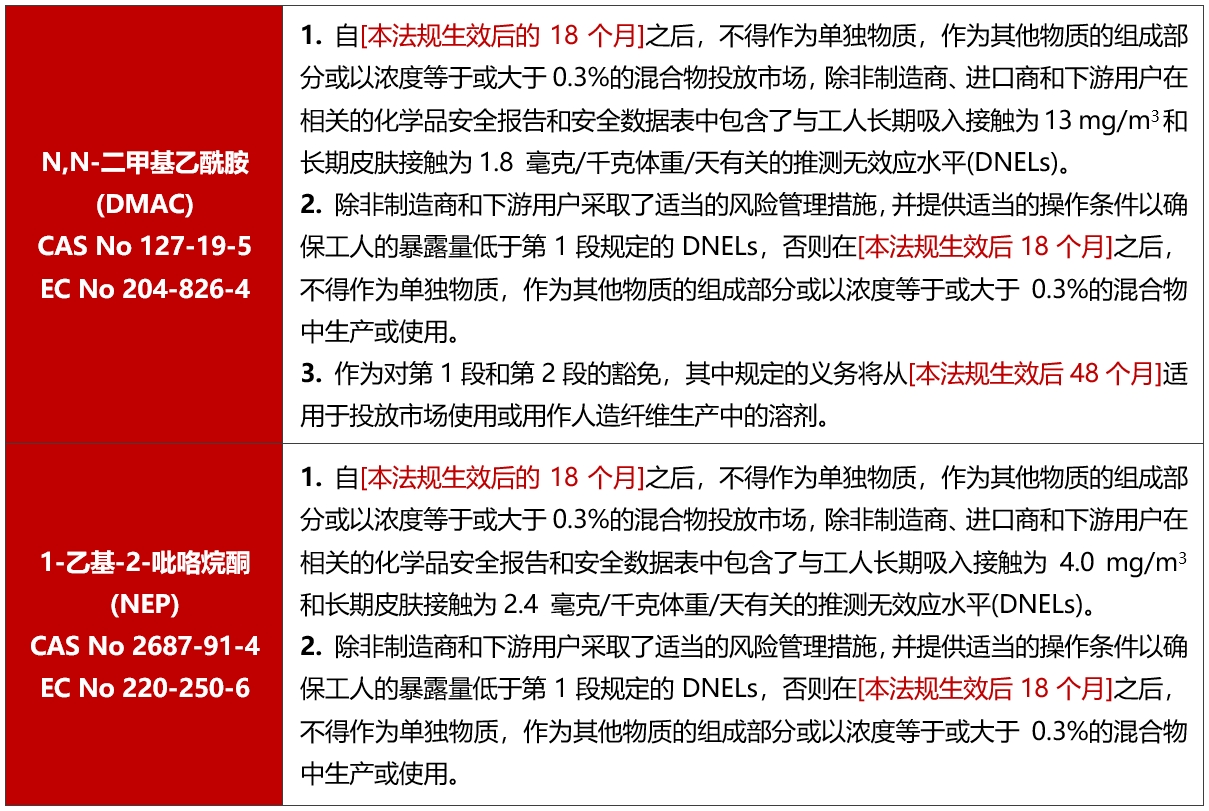 2024年7月30日,欧盟委员会向世界贸易组织(WTO)提交G/TBT/N/EU/1079通知,拟更新REACH法规((EC) No 1907/2006)附录XVII,增加N,N-二甲基乙酰胺(DMAC)和1-乙基-2-吡咯烷酮(NEP)的限制条款。该提案预计将于2025年第一季度通过。