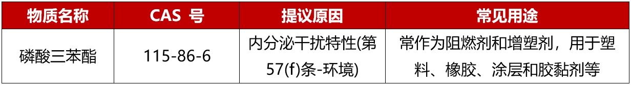 2024年10月16日,欧洲化学品管理局(ECHA)发布消息称,欧盟成员国委员会(MSC)同意将之前暂缓加入高度关注物质(SVHC)清单的磷酸三苯酯(TPP)认定为高度关注物质。ECHA 将于11月初发布公告将该物质正式列入SVHC清单,届时SVHC清单将由241增至242项。