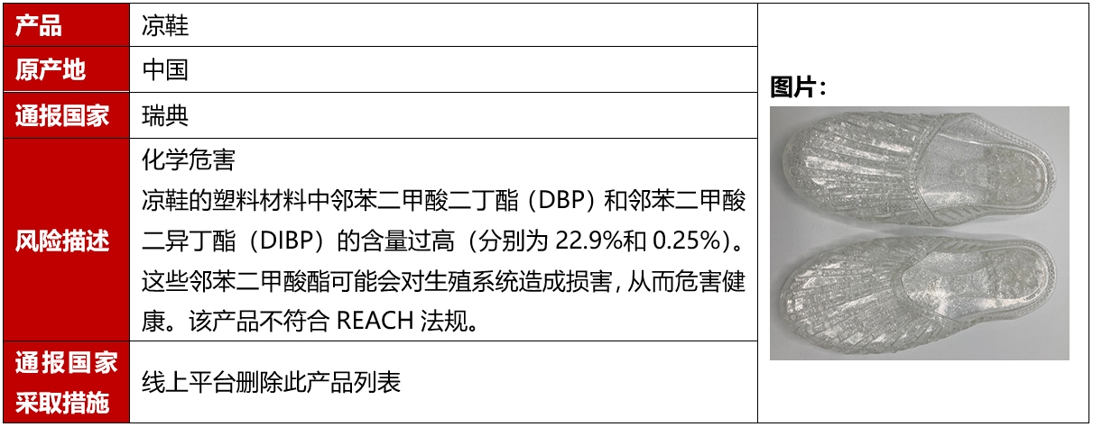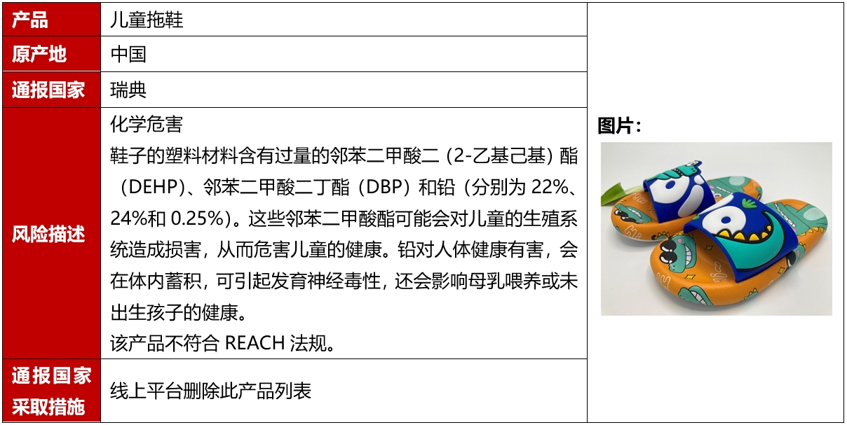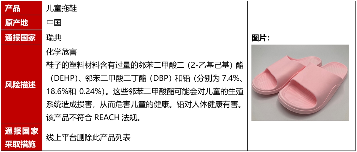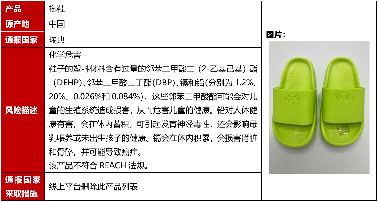 2024年9月,欧盟、美国、加拿大和澳洲共发生5例鞋类召回案例。这些召回发生在欧盟,且是因为存在化学危害被召回的。