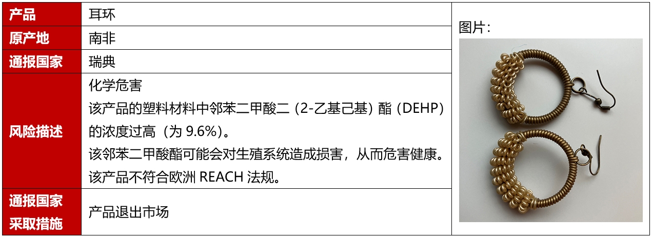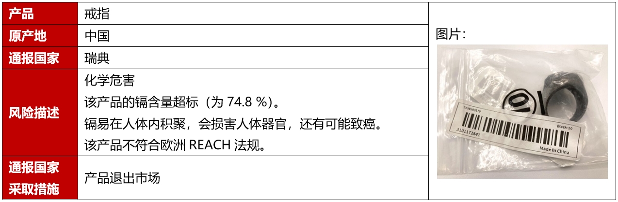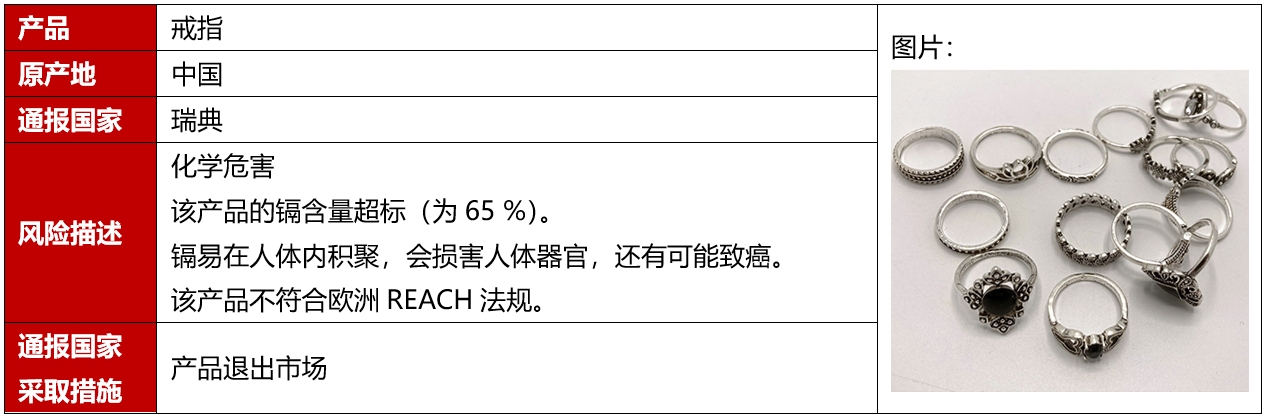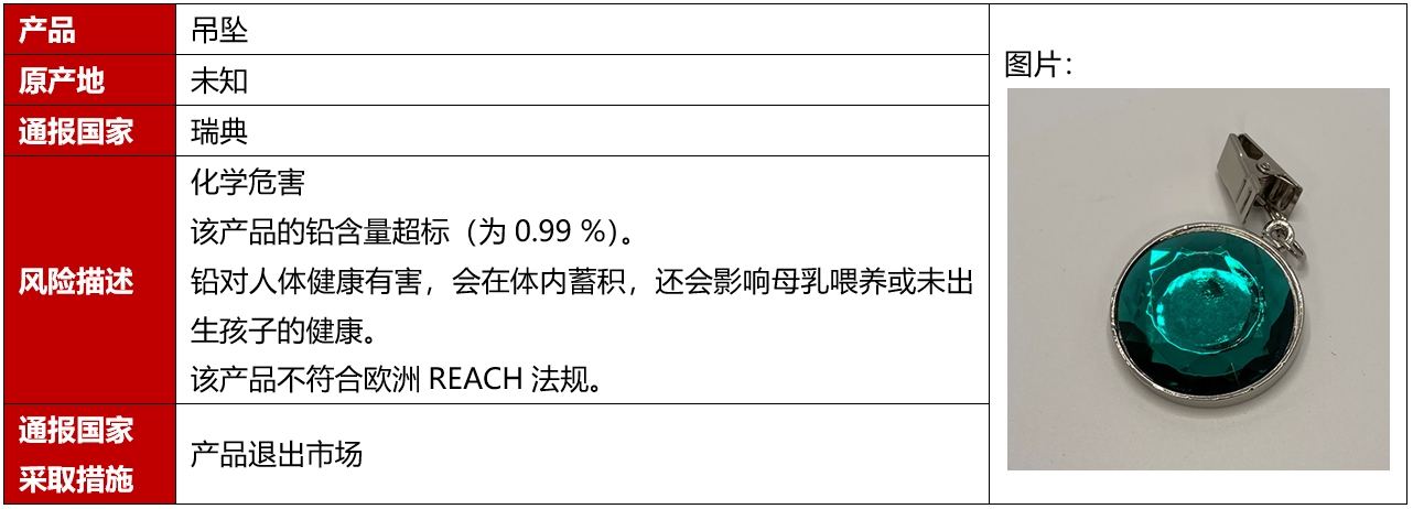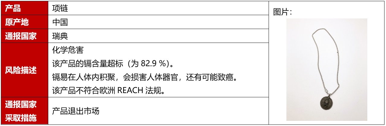2024年10月,欧盟、美国、加拿大和澳洲共发生10例饰品召回案例,这些召回发生在欧盟,且都是因为存在化学危害而被召回的。