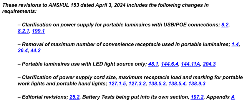 [导读]: 近期,UL发布了最新版移动式灯具安全标准: UL 153: Thirteenth Edition, Dated March 3, 2014,Rev. April 3,2024 此版本为2024年修订版,主要更新了如下内容: 1. 阐明了不带驱...