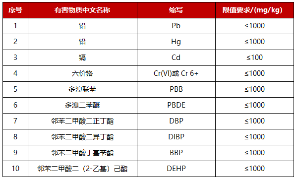(1)将我国电器电子产品管控有害物质种类由六大类增至十大类,保持与国际行业要求一致(新增4种邻苯二甲酸酯类有害物质(PAEs):邻苯二甲酸二正丁酯(DBP)、邻苯二甲酸二异丁酯(DIBP)、邻苯二甲酸丁基苄酯(BBP) 和邻苯二甲酸二(2-乙基)己酯(DHP)的管控限值),详情如下: