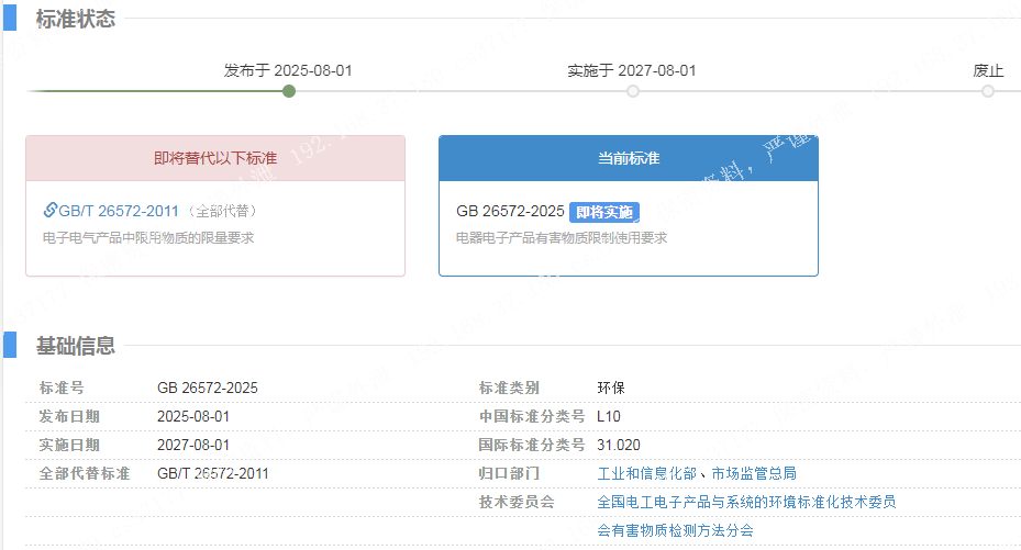 [导读]: 2025年8月1日,中国国家标准化管理委员会(国标委)正式批准发布强制性国家标准GB 26572-2025《电器电子产品有害物质限制使用要求》。新标准将替代原推荐性标准GB/T 26572-2011,成为中国RoHS管控领域首个强制性国家标准,并将于2027年8月1日正式实施。 ...