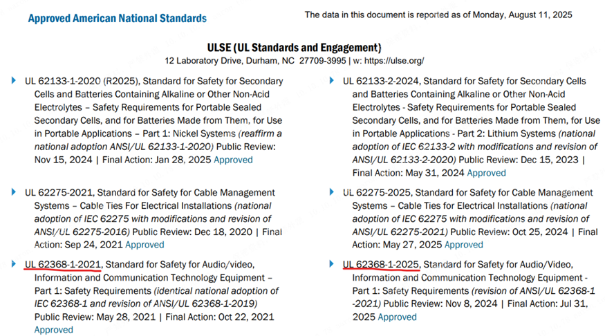 继国际标准IEC 62368-1:2023(第四版)与欧盟标准EN IEC 62368-1:2024(第四版)相继发布后,美国标准UL 62368-1:2025(第四版)于2025年7月31日正式发布,并于当日被美国国家标准学会(ANSI)采纳为美国国家标准。