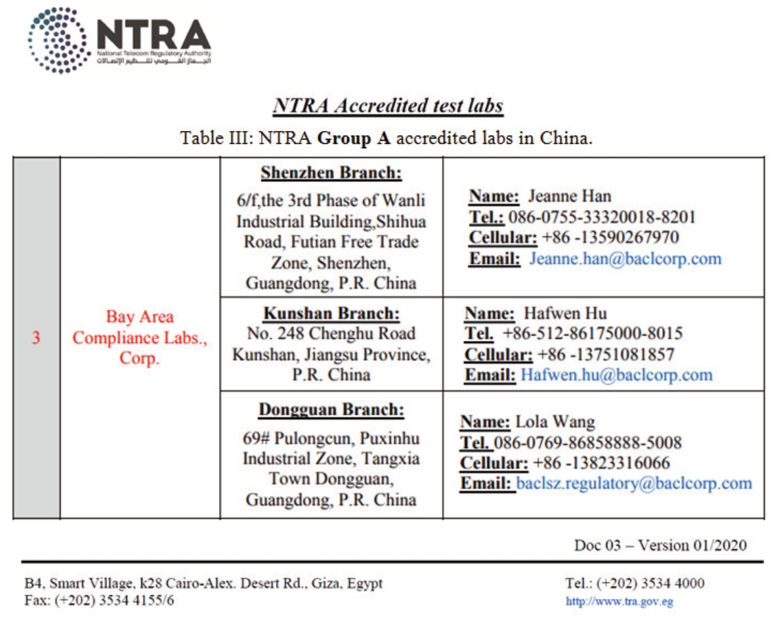 NTRA是埃及国家电信管理局的英文简称,主要管控进口、制造或在埃及装配的通信设备。根据NTRA所颁布的相关法规,所有进入埃及市场的通信设备包括终端设备、无线电通信设备,比如:移动电话、平板电脑、网关、音箱、耳机、摄像头等,皆需取得NTRA型式认证VoC和PVoC。
