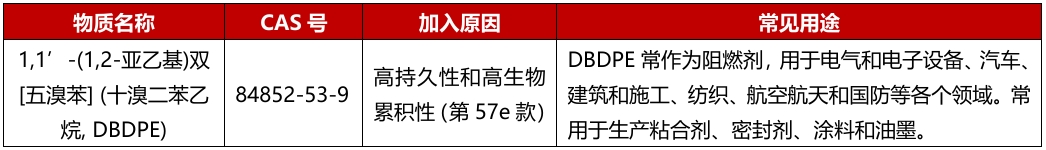 [导读]: 2025年11月5日,欧洲化学品管理局(ECHA)正式将1,1’-(1,2-亚乙基)双[五溴苯](十溴二苯乙烷,DBDPE)纳入REACH高度关注物质(SVHC)清单,至此,REACH高度关注物质清单正式增至251项。 新增物质的信息如下: &nb...