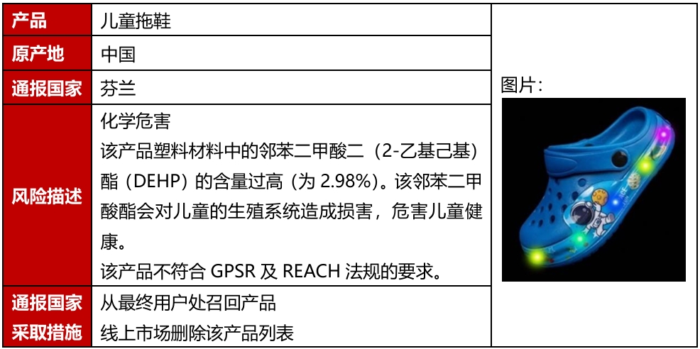 2025年11月,欧盟、美国、加拿大和澳洲共发生6例鞋类召回案例。该召回发生在欧盟,且是因为存在化学或环境危害被召回。