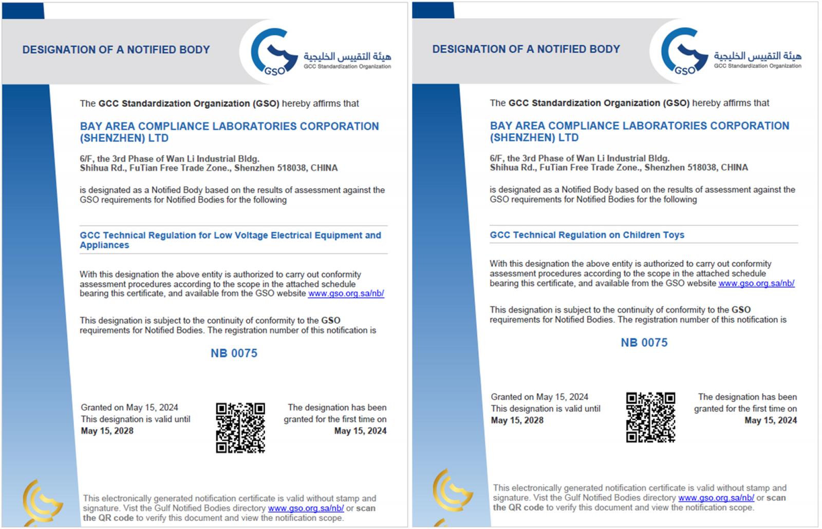 BACL已是GSO认定的低压电气设备(LVE)、玩具产品(Toys)及水效(WER)三大领域公告机构(NB),能够为企业提供更加全面高效的一站式检测认证服务,确保企业产品符合GCC技术法规并颁发G-Mark,帮助企业快速抢占海湾市场,拓展海外贸易新空间。