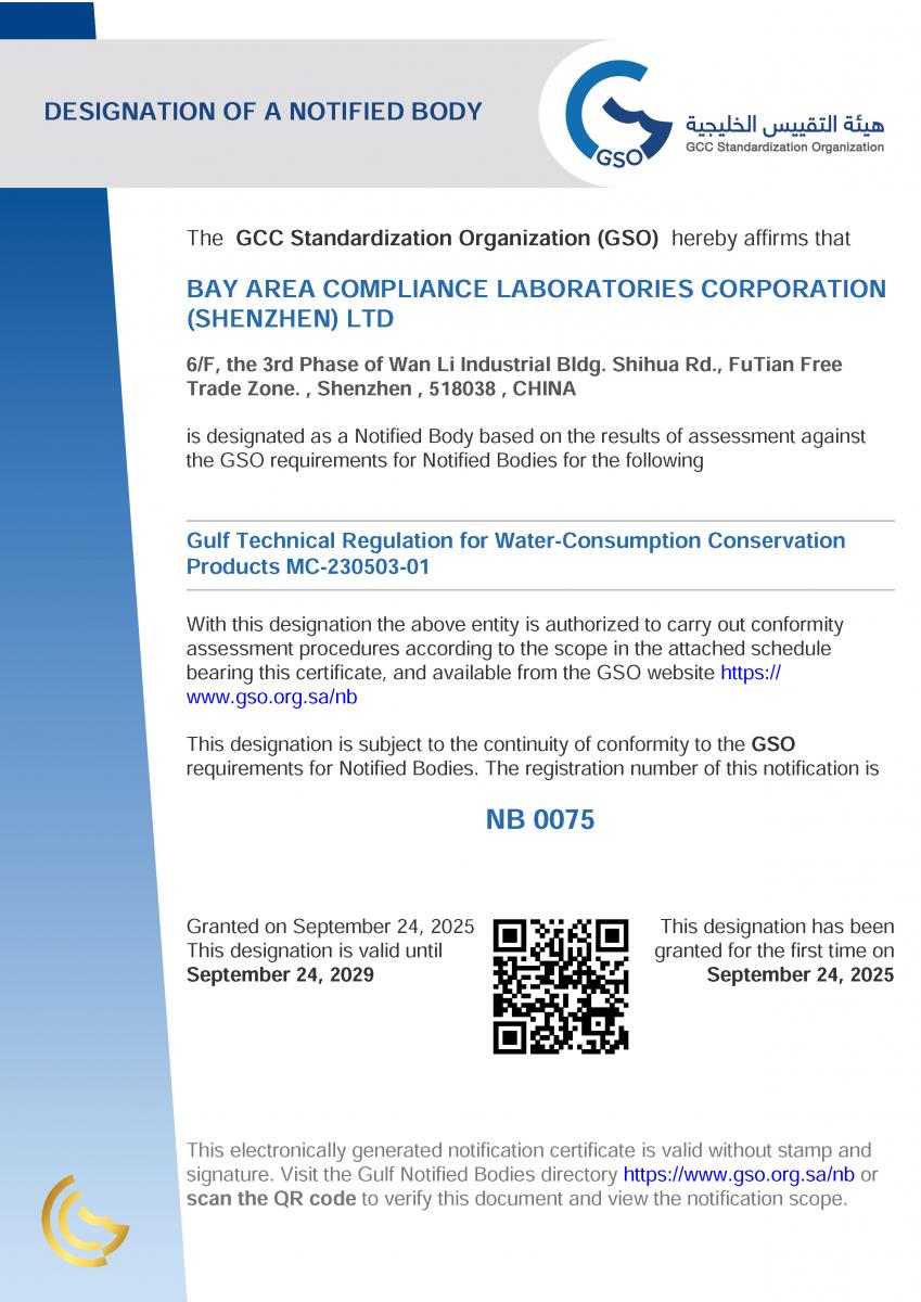 根据GSO技术法规MC-230503-01,BACL已正式被GSO指定为海湾节水产品技术法规的公告机构(NB),可为卫浴及节水产品制造商提供专业的法规支持,涵盖合格评定、技术文件审核以及基于GSO标准与法规的定制化解决方案等,助力产品顺利出口至海湾国家!