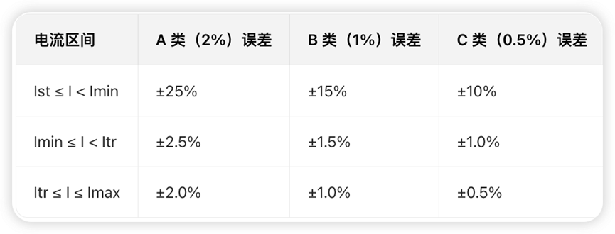 1. 精度等级与误差限值:标准将充电桩分为A(2%)、B(1%)、C(0.5%)三个精度等级,不同电流区间(启动电流Ist-最小电流Imin、最小电流Imin-过渡电流Itr、过渡电流Itr-最大电流Imax)对应明确误差限值(功率因数>0.9时),其中公共充电桩不推荐采用A类精度。具体要求如下: