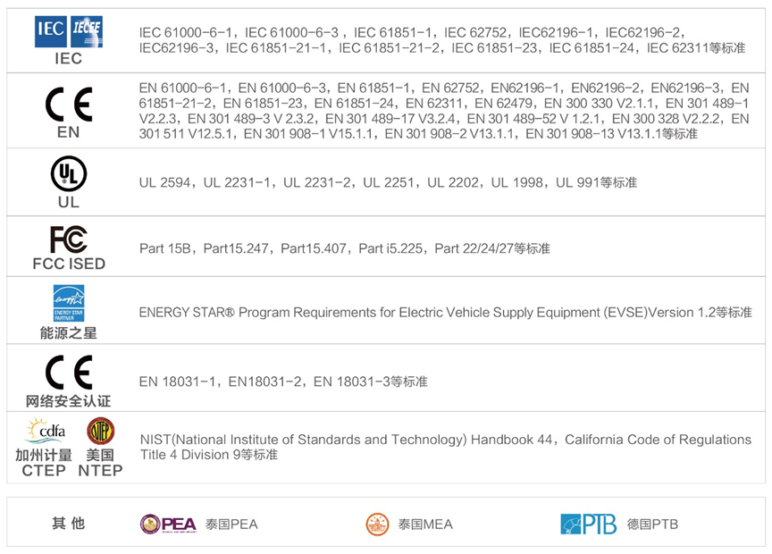 我们的充电桩测试认证能力涵盖CE、FCC、NTRA、CTEP、NTEP、PTB、PEA、MEA等。