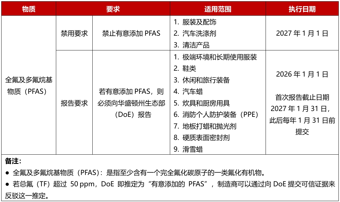2025 年 11 月 20 日,美国华盛顿州生态部(DoE)通过了对《华盛顿行政法规》(WAC)第173-337章《更安全产品限制与报告》的修订规则,新规新增了3类产品全氟及多氟烷基物质(PFAS)的禁用要求和9类产品PFAS的报告要求。