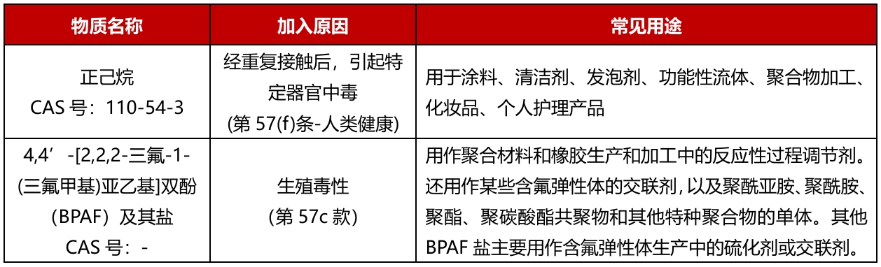 [导读]: 2026年2月4日,欧洲化学品管理局(ECHA)正式将正己烷和4,4’-[2,2,2-三氟-1-(三氟甲基)亚乙基]双酚(BPAF)及其盐两项物质纳入REACH高度关注物质(SVHC)清单。与此两项物质同时进行评议的4,4’-二羟基二苯甲烷(双酚F,BPF)被撤回,未被纳入S...