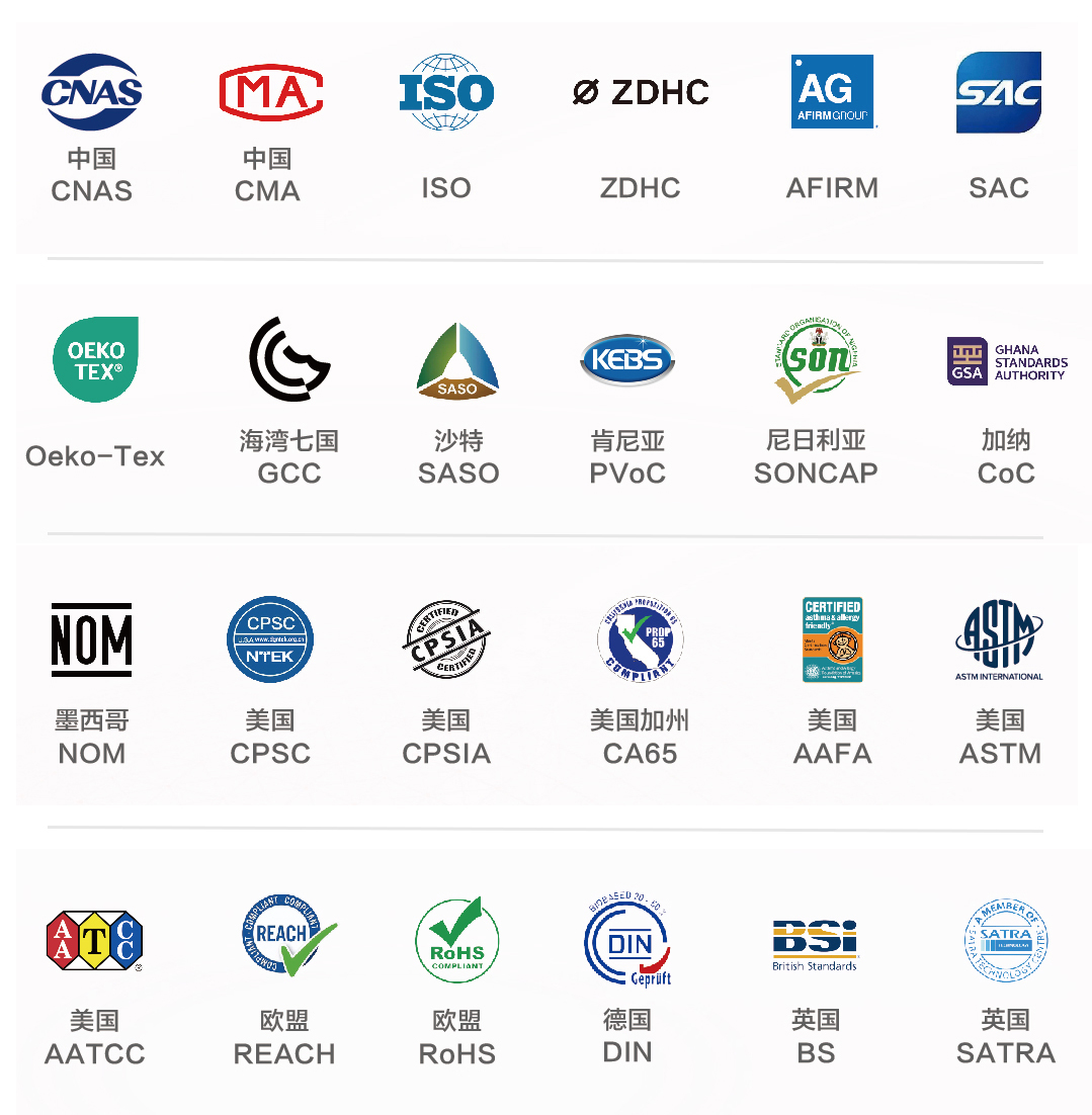 我们在美国、越南及中国深圳、东莞、厦门等地均设有理化实验室,获得了CNAS、CMA、IAS、CPSC等权威资质;我们具备ZDHC MRSL符合性认证及美国CPC、沙特SASO、海湾七国GCC等发证能力,拥有丰富的AFIRM、SAC、Oeko-Tex、REACH、RoHS、CA65、CPSIA、AAFA、ASTM、AATCC、PVoC、SONCAP、CoC等国际认证经验,可快速为您的产品出具相关认证报告。