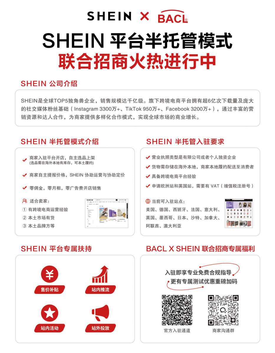 展会现场,BACL还将与SHEIN强强联合,面向全品类推出“半托管模式联合招商”,以专业检测认证能力助力商家布局跨境电商市场。
